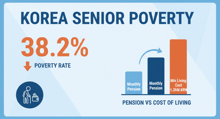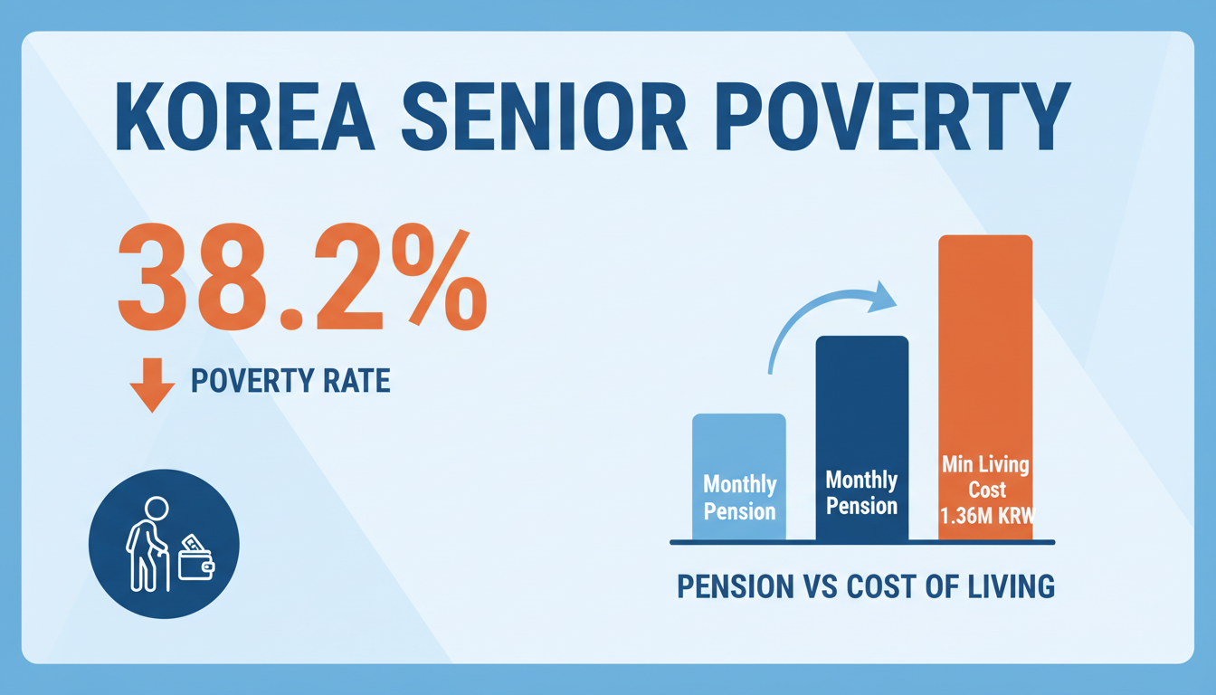 보건복지부와 통계청의 자료에 따르면 2023년 기준 65세 이상 고령층의 상대적 빈곤율은 38.2%에 달합니다. 이는 전체 인구 빈곤율 14.9%나 근로 연령층 빈곤율 9.8%와 비교했을 때 압도적으로 높은 수치로, 한국 노인 빈곤의 심각성을 단적으로 보여줍니다.