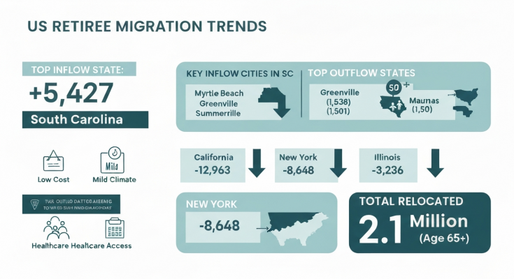 사우스캐롤라이나 주는 2025년에 총 5,427명의 은퇴자를 순증가시켰습니다. 이러한 유입은 주로 다른 주에서 이동해 온 은퇴자들에 의해 주도되었는데, 특히 노스캐롤라이나(2,014명), 플로리다(1,862명), 뉴욕(1,010명), 조지아(982명), 펜실베이니아(729명)에서 많은 인구가 유입되었습니다.