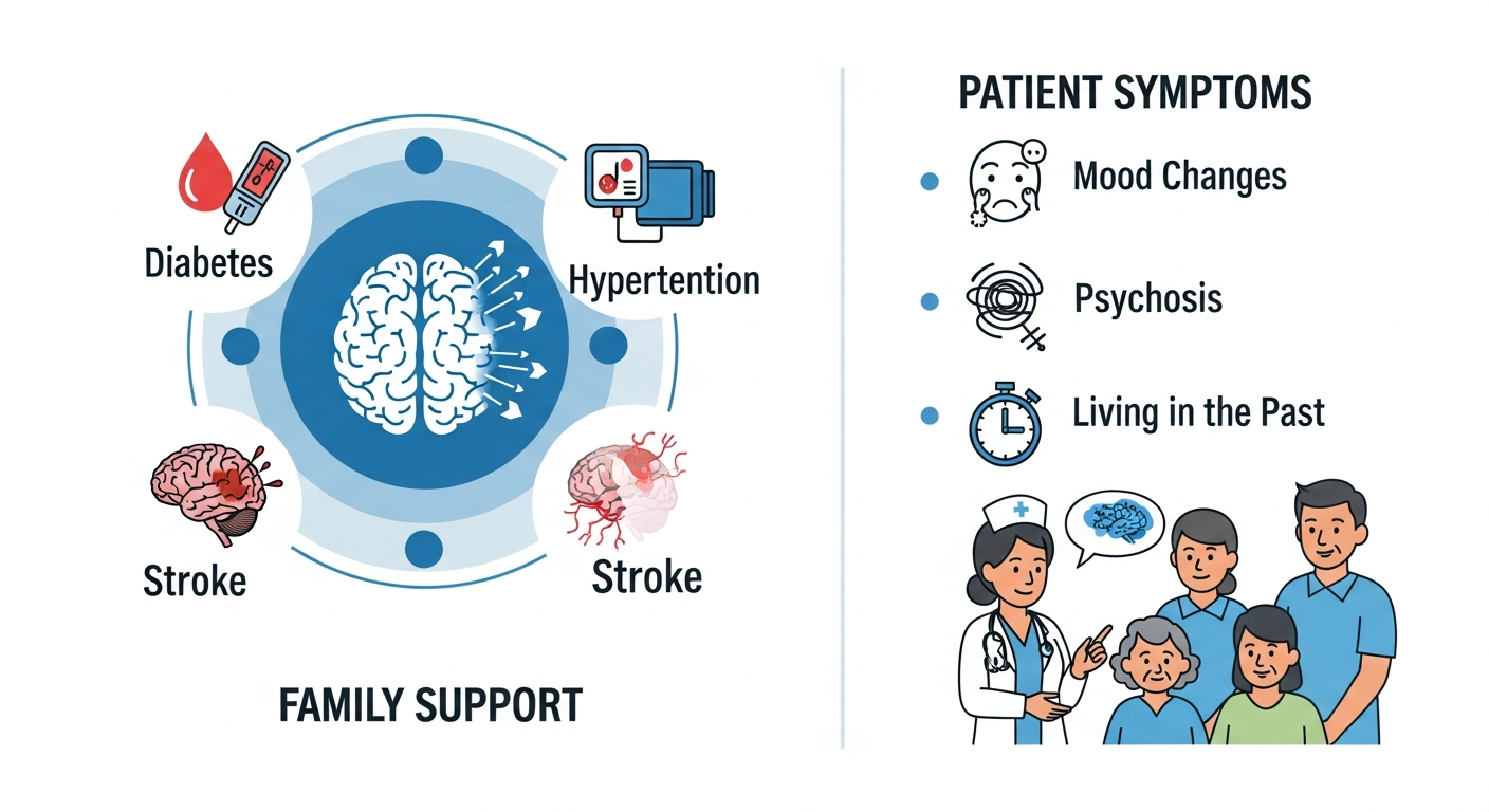 특히 환자들의 증상은 매우 다양하게 나타납니다. 일부는 기분 변화나 행동의 이상을 보이기도 하며, 심한 경우 현실과 단절되어 과거 속에 사는 ‘정신증(psychosis)’ 증상을 보이기도 합니다. 예를 들어, 환자가 자신이 여전히 20대나 30대인 것처럼 느끼고 그 연령대에나 적합한 활동을 하려고 시도하는 경우가 있는데, 이는 가족과 의료진이 자주 논의하고 대처해야 할 중요한 문제입니다.