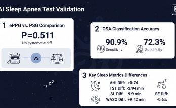 인공지능 기반 단일 채널 광혈류측정 가정용 수면 무호흡증 검사(ePPG)의 유효성 검증 미국에서 발표된 연구에 따르면, 인공지능(AI) 기반의 단일 채널 광혈류측정(ePPG) 소프트웨어가 가정용 수면 무호흡증 검사(HSAT) 기기로서의 유효성을 입증했습니다. 이 연구 …